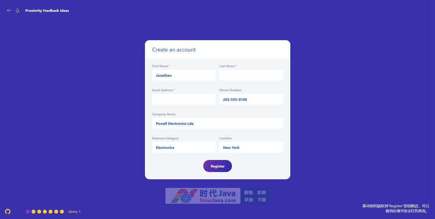 在第一个示例中,当鼠标接近“注册”按钮时,如果表单中的必填字段为空时,这些字段会以红色边框闪烁标示。