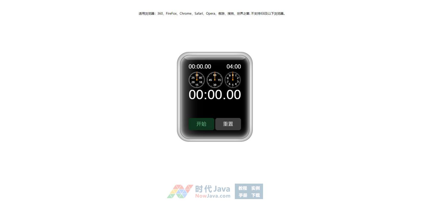 JS+CSS3实现的类似于苹果iwatch计时器特效源码是一段实现了类似于最近最火爆的苹果iwatch计时器效果的代码,带有开始和重置按钮,支持计次显示。本段代码适应于所有网页使用,有兴趣的朋友们可以前来下载使用。本段代码兼容目前最新的各类主流浏览器,是一款非常优秀的特效源码。