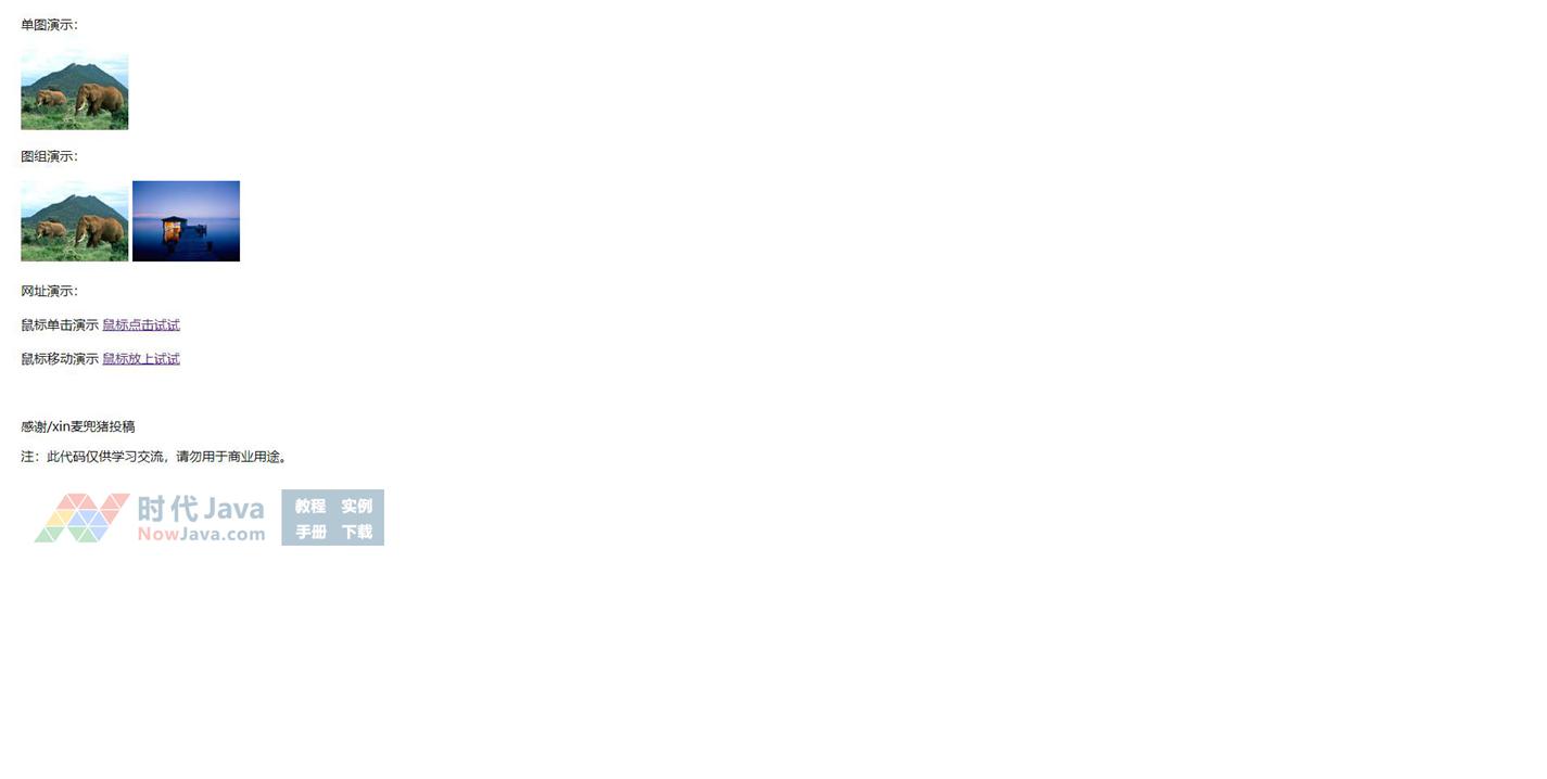 一个漂亮相册中的Js图片展示效果,这里只包括图片展示部分,一共有两种效果:鼠标点击后放大图片,另一种是鼠标放上后放大图片;你完全可以将它用于你程序中的图片展示功能,这个特效并非jQuery,是一个封装好的JS类,所含示例向我们介绍了如何去调用它。