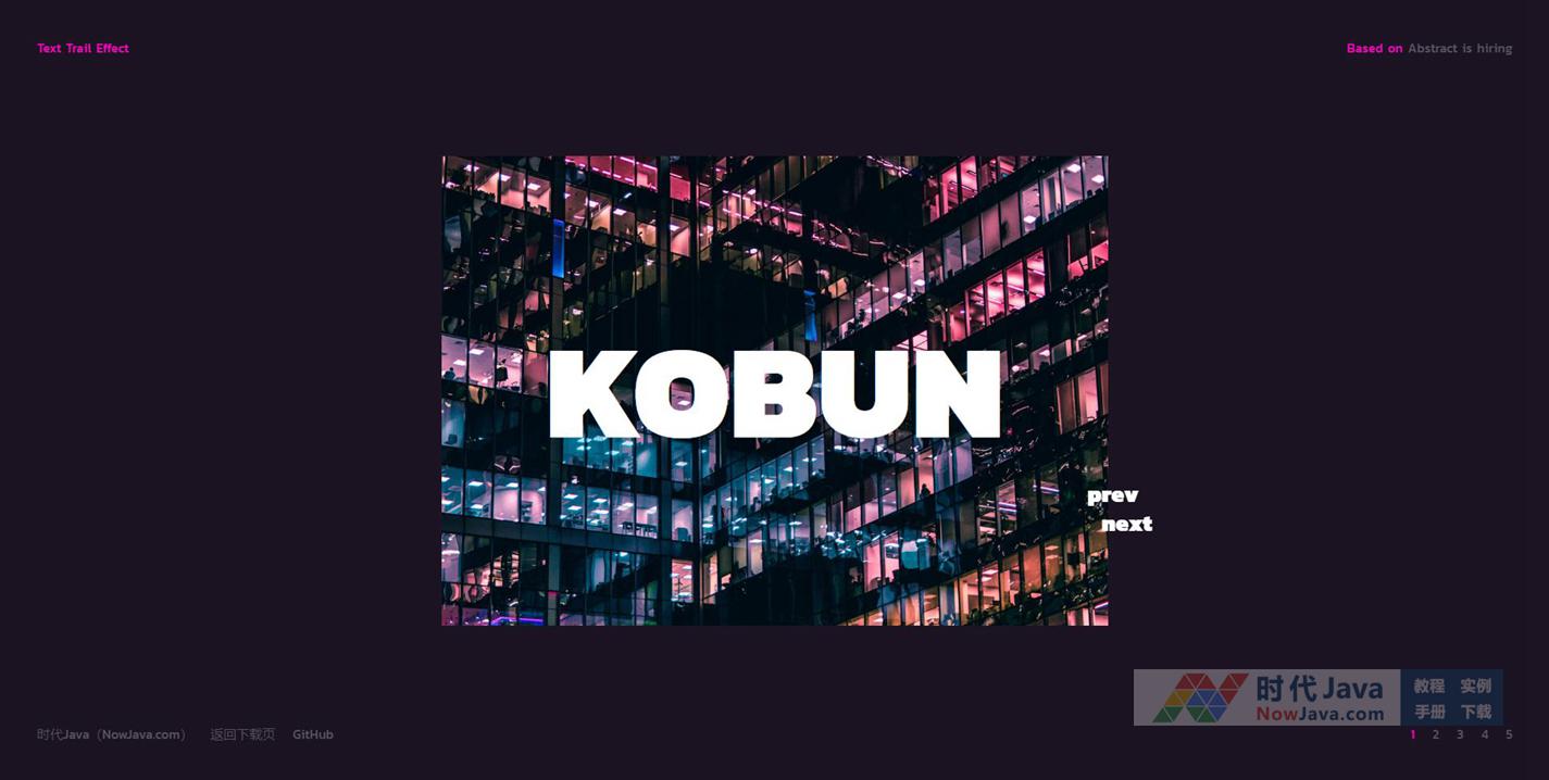 这是一个实现带幻影文字效果的炫酷js轮播图特效。该轮播图特效的创意是在切换轮播图时,将文字以幻影的方式隐藏和显示,效果非常炫酷,欢迎下载!
