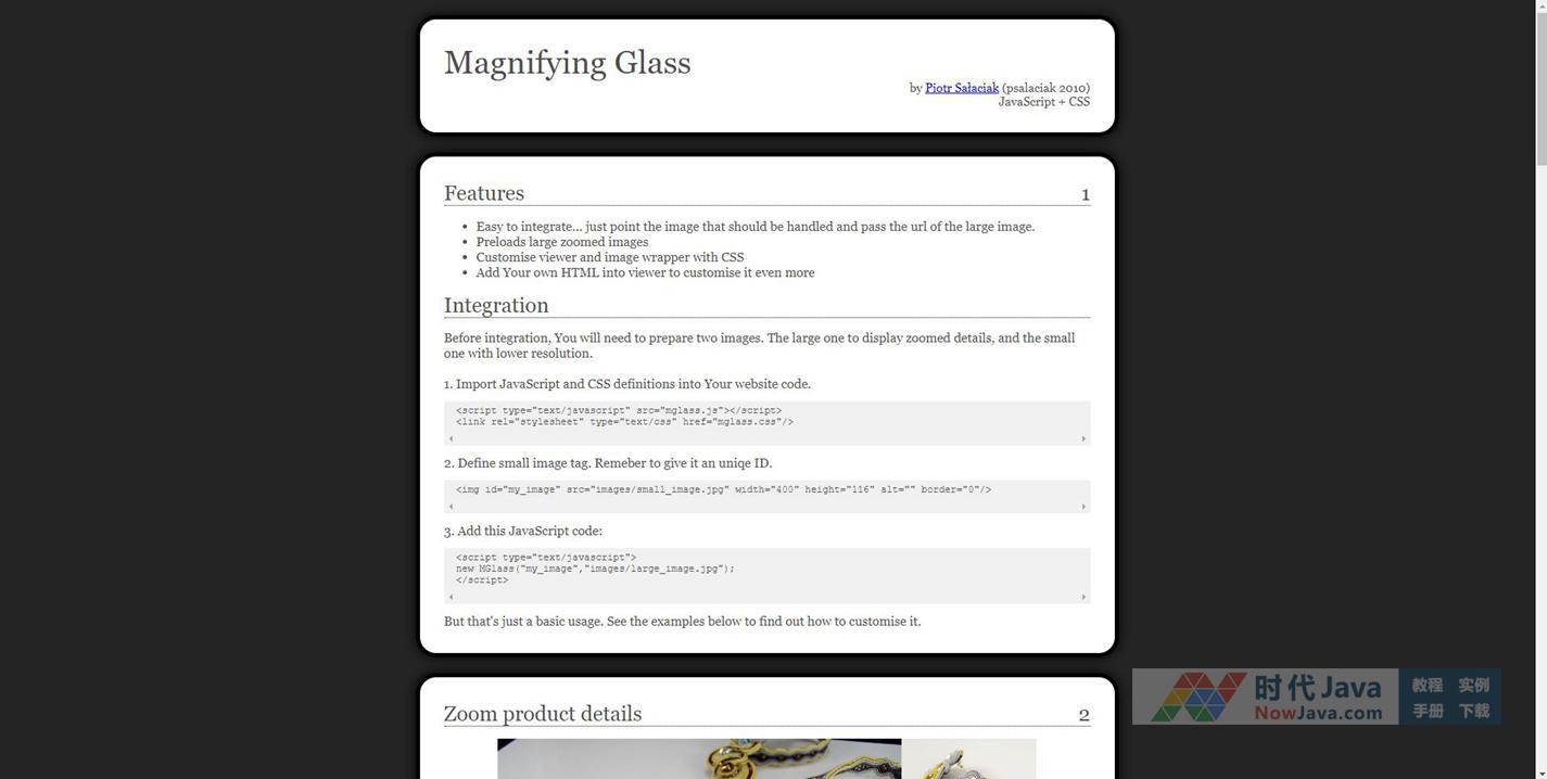 Magnifying Glass来自国外的一个奇幻的图片放大技术,兼容多种浏览器,适用于商城或公司网站商品图片放大,或商品页放大镜,有多种显示效果:原图片模糊,放大后清淅,原图片和放大后保持不变,仅放大,还有一种是局部放大功能,也非常实用。总之为说,Magnifying Glass已经是一个成形的作品了。示例页同时也是教程页,使用方法和代码都已经给出了,好好看下,应该不难使用。