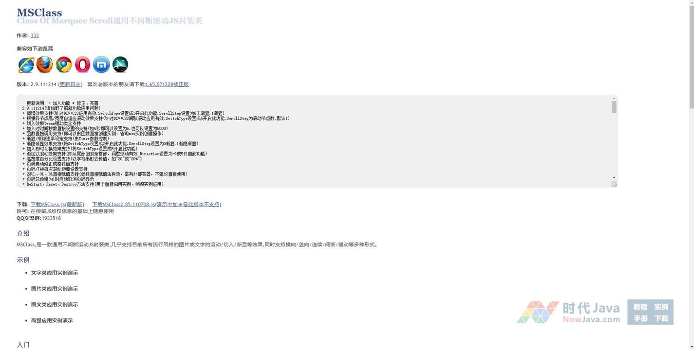 MSClass,是一款通用不间断滚动JS封装类,几乎支持目前所有流行风格的图片或文字的滚动/切入/渐显等效果,同时支持横向/竖向/连续/间断/缓动等多种形式。