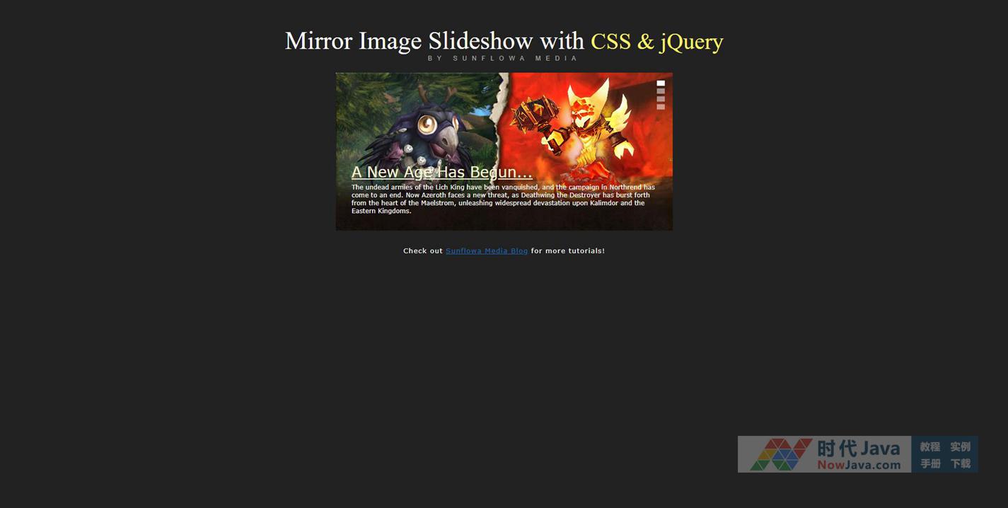 因为最近在玩魔兽世界,访问了韩国魔兽官网,感叹韩国人做游戏网站真的是很给力啊,看到中间的幻灯片是用jQuery做的,效果还不错,就把它扒下来了,不太兼容IE6,对CSS和jQuery做了整理,现在可以兼容大众浏览器了。部分效果使用了CSS3圆角,如需最好效果请使用FF等浏览器。