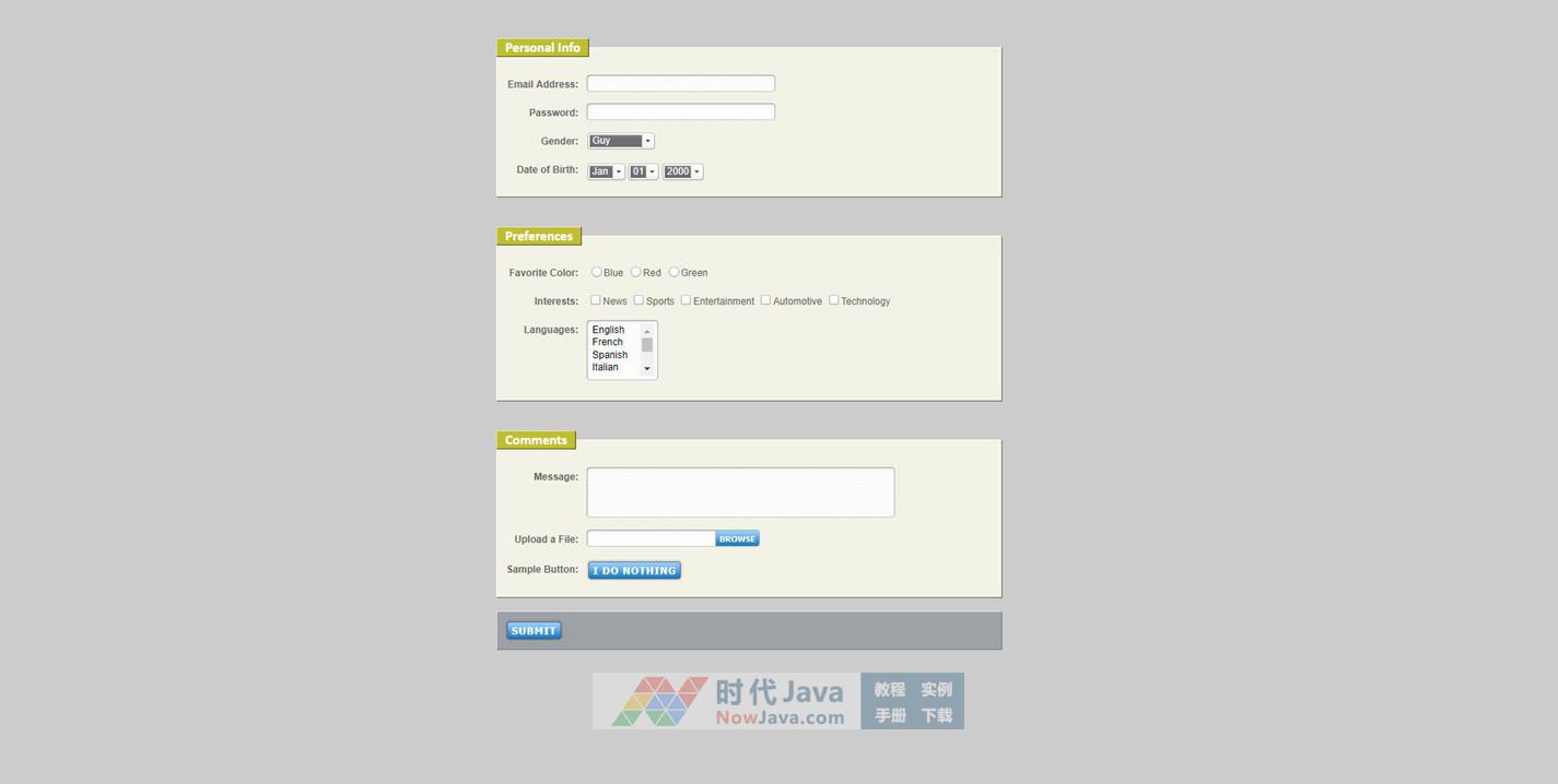 niceforms.js各种已美化的常用表单元素控件效果,很漂亮的表单,比较不错,我看到之后都目瞪口呆,相当不错并且很时尚的效果,尤其是select下来框及textarea多选框的美化。使用niceforms.js表单美化控件,可对表单控件的文本框、下拉框、单选按钮、复选按钮、文本域、文件域、提交按钮等常用元素进行风格美化,最终效果相当漂亮