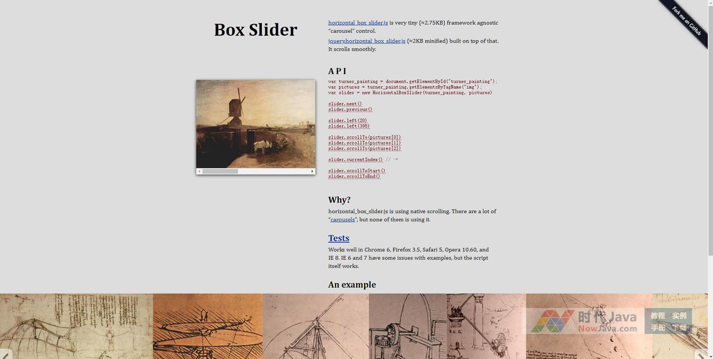 horizontal_box_slider是一个限定在制定框内滑动显示的jquery插件,可以把多幅图片放到一个制定的box内,通过下方自动出现的滚动条横向滑动显示图片