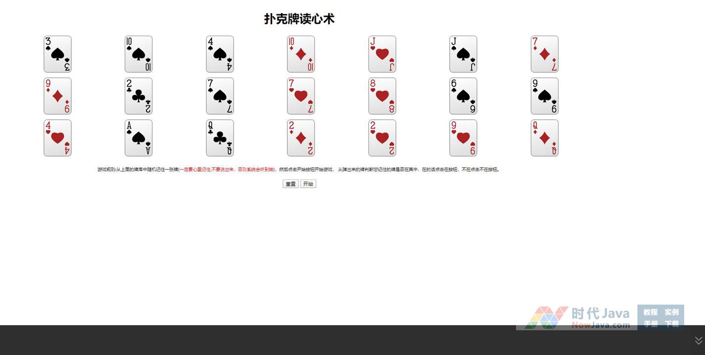 jQuery扑克牌读心术游戏基于jquery-1.7.1.min.js制作。 本段代码适应于所有网页使用,有兴趣的朋友们可以前来下载使用。本段代码兼容目前最新的各类主流浏览器,是一款非常优秀的特效源码。