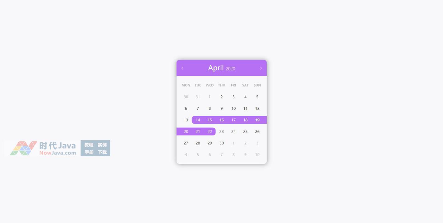 这是一款ReactJS日期范围选择控件源码,界面默认显示当前月份的日历日期,除了基本的月份显示功能外还提供了日期选择功能。用户点击起始日期后,再点击结束日期,则可以选中两者之间的所有日期。默认为选中标注当前星期里的所有日期。整体界面风格简洁美观,是一款比较经典的日期选择插件。建议使用支持HTML5与css3效果较好的火狐(Firefox)或谷歌(Chrome)等浏览器预览本源码。