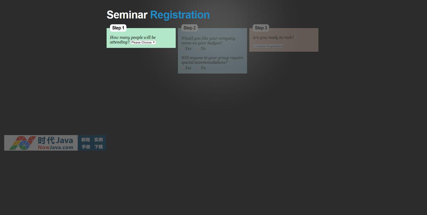Seminar Registration 用户注册条款插件,这款插件专一是为网站用户注册而生,核心基于jQuery。预览约定好注册的各种所需条件,本程序很方便的会实现一个快速注册的Ajax步骤表单,一步步完成注册。如上图所示,在本实例 中,注册被约定为三步,每一步又有逐多选项,用户选择不同的选项会显示不同的内容,直到三个步骤全部实现后注册即可完成。