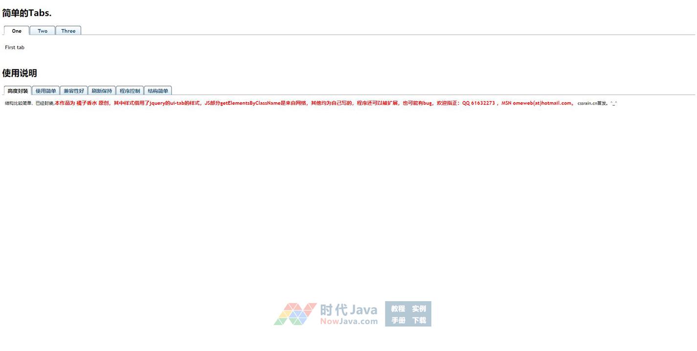 <div id="container-1"><!--使用时: var s=new UI_TAB();s.init("container-1");--> <ul class="ui-tabs-nav"> <li class="ui-tabs-selected"><a href="#fragment-1"><span>One</span></a></li> <li class=""><a href="#fragment-2"><span>Two</span></a></li> <li class=""><a href="#fragment-3"><span>Three</span></a></li> </ul> <!--上面的导航项目全放在class为的UL下面的LI下,高亮部分依次是默认显示的项目,显示内容的id,选项卡的标题--> <div style="display: block;" class="ui-tabs-panel ui-tabs-hide" id="fragment-1"> <p>First tab</p> </div> <!--上面的结构就是内容的结构,高亮部分依次是默认显示的内容,每一个内容都要有的class,以及和选项卡对应的ID--> <div class="ui-tabs-panel ui-tabs-hide" id="fragment-2"> <p>Second tab</p> </div> <div class="ui-tabs-panel ui-tabs-hide" id="fragment-3"> <p>Third tab</p> </div></div>