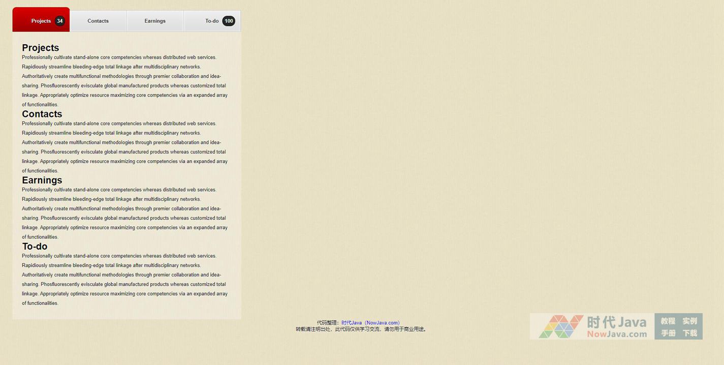 jquery实现的非常时尚的tab选项卡动态切换效果,鼠标点击选项卡,内容会滑动切换,而且内容可以是任意html或其他的东东哦,经测试效果非常时尚好看,不可多得