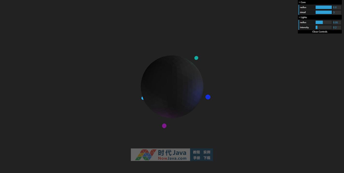 这是一款基于three.js实现的小球周围光源旋转动画效果源码。画面中心一个立体的小球周围有5个彩色的发光小球围绕中心球体旋转,在小球经过球体表面的位置会留下相印颜色的发光照明视觉效果。右上方的控制面板可调节小球直径、发光强弱、中心球体的表面积、大小等参数。建议使用支持HTML5与css3效果较好的火狐(Firefox)或谷歌(Chrome)等浏览器预览本源码。