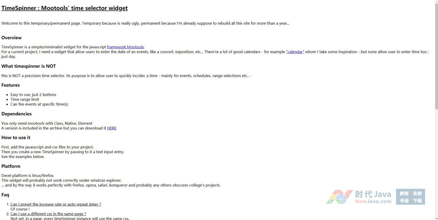 mootools实现的timespinner时间选择调节器效果,通过此时间选择器可以实现时间微调,比如每次向前或者向后调节5分钟、10分钟,具体调节幅度可以自己定义,非常实用。