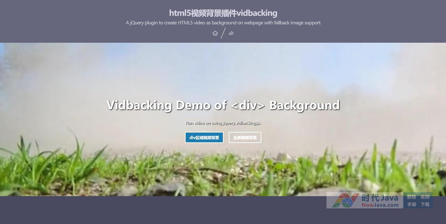 vidbacking是一款响应式的跨平台的html5视频背景插件。该视频背景插件允许你在页面中的某个div后整个页面中使用HTML5视频作为背景。如果浏览器不支持HTML5视频,插件会自动将背景回退为指定的背景图片。本代码适用浏览器:搜狗、360、FireFox(建议)、Chrome、Safari、Opera、傲游、世界之窗,不支持IE8及以下浏览器,首选火狐浏览器。是一款不错的的特效插件,需要的朋友可以下载!希望大家喜欢!