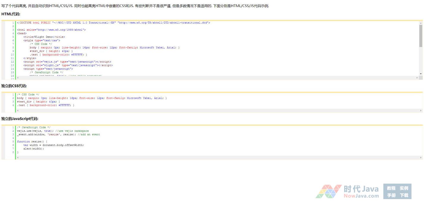 自己动手写了个代码高亮库,附有使用实例,还没有起名字,自我感觉良好。可自动识别HTML/CSS/JS代码,同时也能高亮显示HTML网页中嵌套的CSS和JS,有些判断并不是很严谨,但是多数情况下是适用的,SyntaxHighlighter的功能也具备了,但是加载很快,不臃肿,优点多多哦……