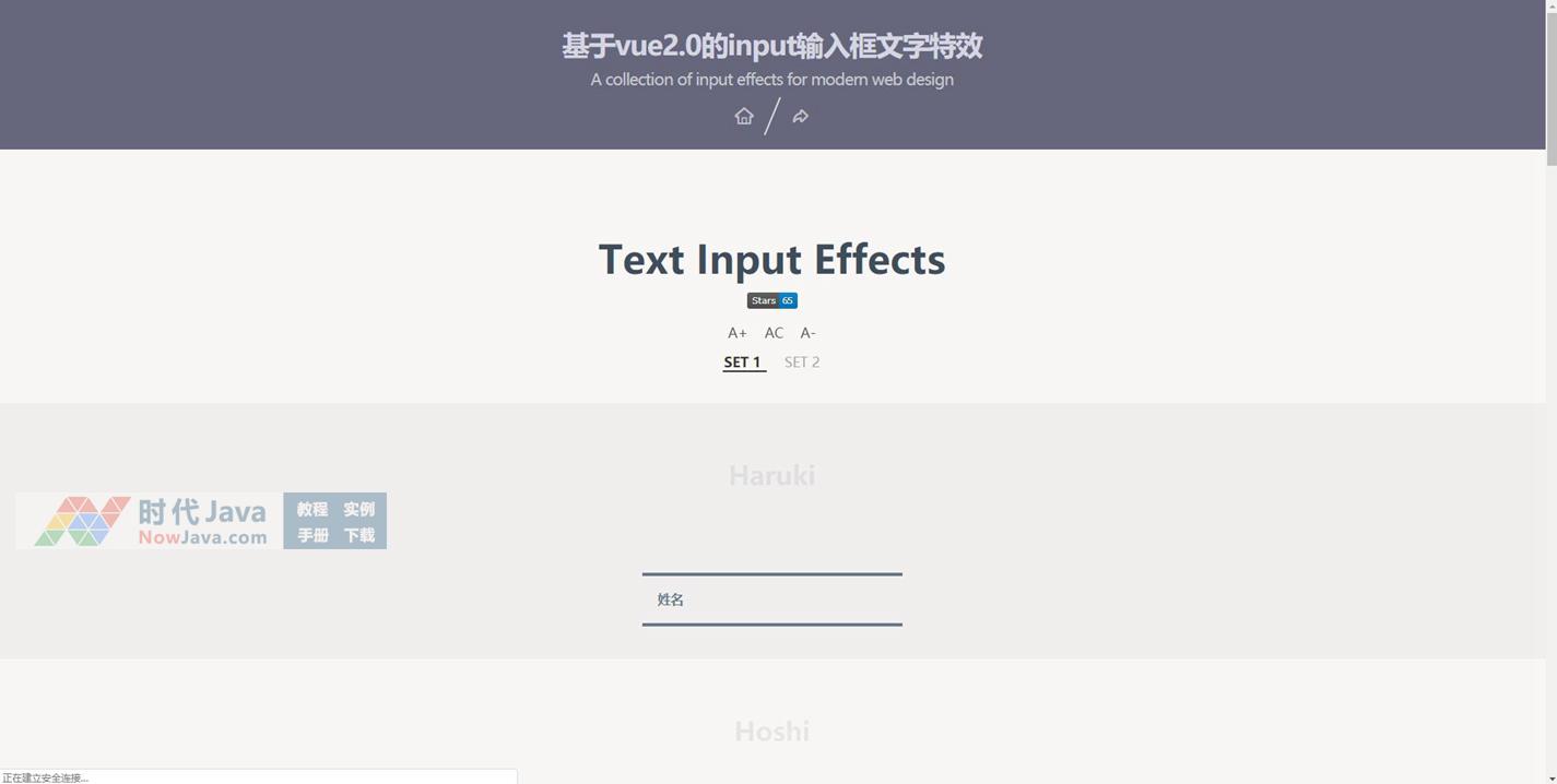 这是一个基于vue2.0的input输入框文字特效。该input输入框特效在输入框聚焦时,为输入框添加多种动画效果,极大提高交互效果。effect-input的type属性为主题名。可用的主题共有19种动画特效,并且可改变主题输入框字体大小,欢迎下载试用!本代码适用浏览器:搜狗、360、FireFox(建议)、Chrome、Safari、Opera、傲游、世界之窗,不支持IE8及以下浏览器,首选火狐浏览器。是一款不错的的特效插件,需要的朋友可以下载!希望大家喜欢!