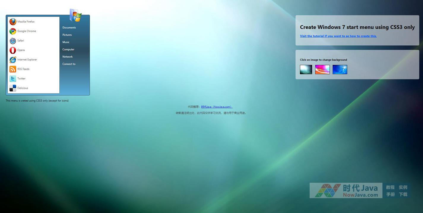 jQuery+CSS3模拟windows7的开始菜单效果,效果非常逼真,还可以更换桌面背景,完全可以在浏览器内模拟真实的windows7效果,经测试效果相当不错,热爱时尚的朋友可以下载试用