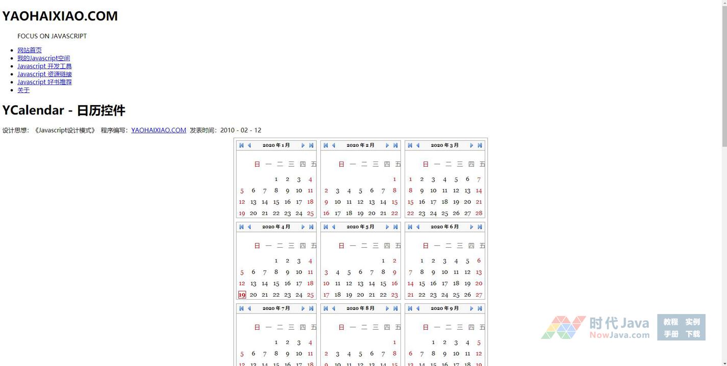 YCalendar - 日历控件,这个控件是在《Javascript设计模式》一书中第十三章《享元模式》的Web日历代码的基础上修改扩展出来的。基本实现了一个简单的日历控件的功能,setYear()方法显示年历,setMonth()方法显示月历。程序还不很完善,仅供大家学设计模式参考之用。当然你也可以完善这个控件作为开发使用,我以后也会完善它的。