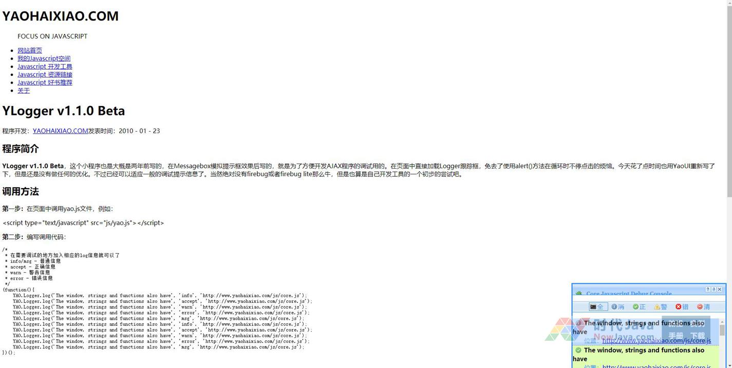 YLogger v1.1.0 Beta,这个小程序也是大概是两年前写的,在Messagebox模拟提示框效果后写的,就是为了方便开发AJAX程序的调试用的。在页面中直接加载Logger跟踪框,免去了使用alert()方法在循环时不停点击的烦恼。今天花了点时间也用YaoUI重新写了下,但是还是没有做任何的优化。不过已经可以适应一般的调试提示信息了。当然绝对没有firebug或者firebug lite那么牛,但是也算是自己开发工具的一个初步的尝试吧。