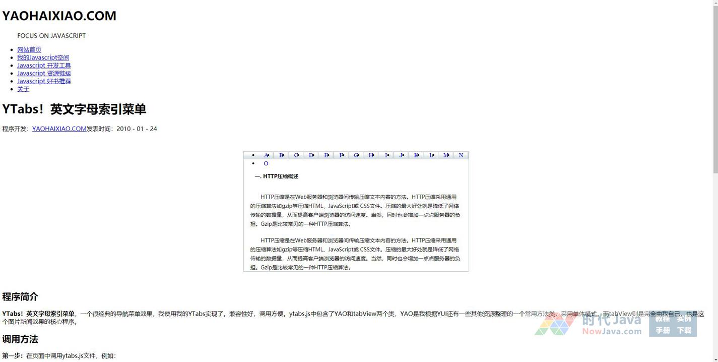 YTabs!英文字母索引菜单,一个很经典的导航菜单效果,我使用我的YTabs实现了。兼容性好,调用方便。ytabs.js中包含了YAO和tabView两个类,YAO是我根据YUI还有一些其他资源整理的一个常用方法类,采用单体模式。而tabView则是完全由我自己,也是这个图片新闻效果的核心程序。