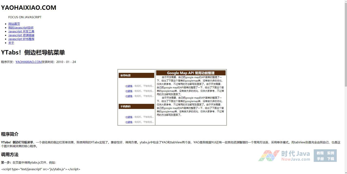 YTabs!侧边栏导航菜单,一个很经典的侧边栏菜单效果,我使用我的YTabs实现了。兼容性好,调用方便。ytabs.js中包含了YAO和tabView两个类,YAO是我根据YUI还有一些其他资源整理的一个常用方法类,采用单体模式。而tabView则是完全由我自己,也是这个图片新闻效果的核心程序。