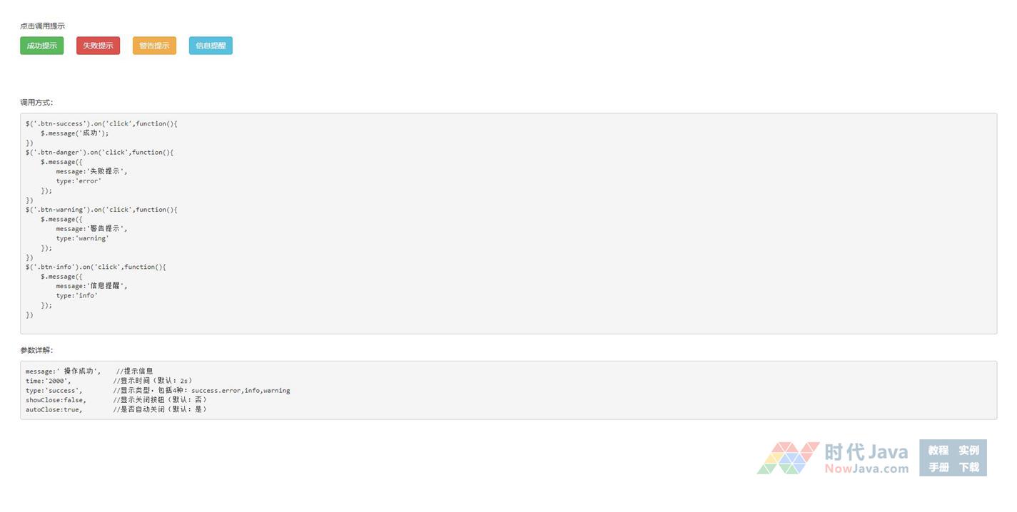 jquery点击按钮调用提示框代码,4种样式提示框,成功提示,失败提示,警告提示,信息提醒等。