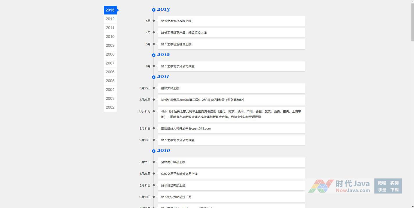 网站大事记jQuery时间轴是一款站长之家网站大事记的时间轴,可按年份查看,带有滑动切换效果。