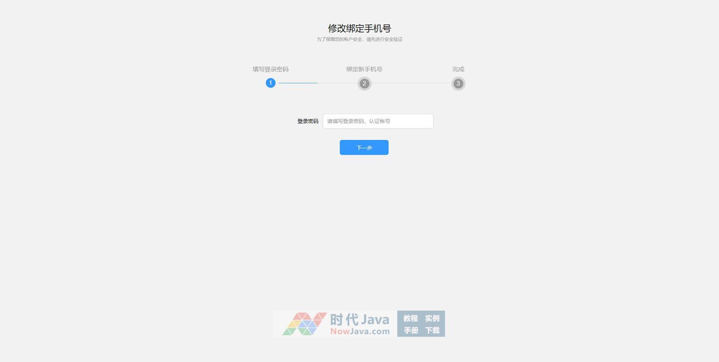 js输入密码修改绑定手机号表单代码,带流程步骤,填写登录密码,绑定新手机号码,完成修改。