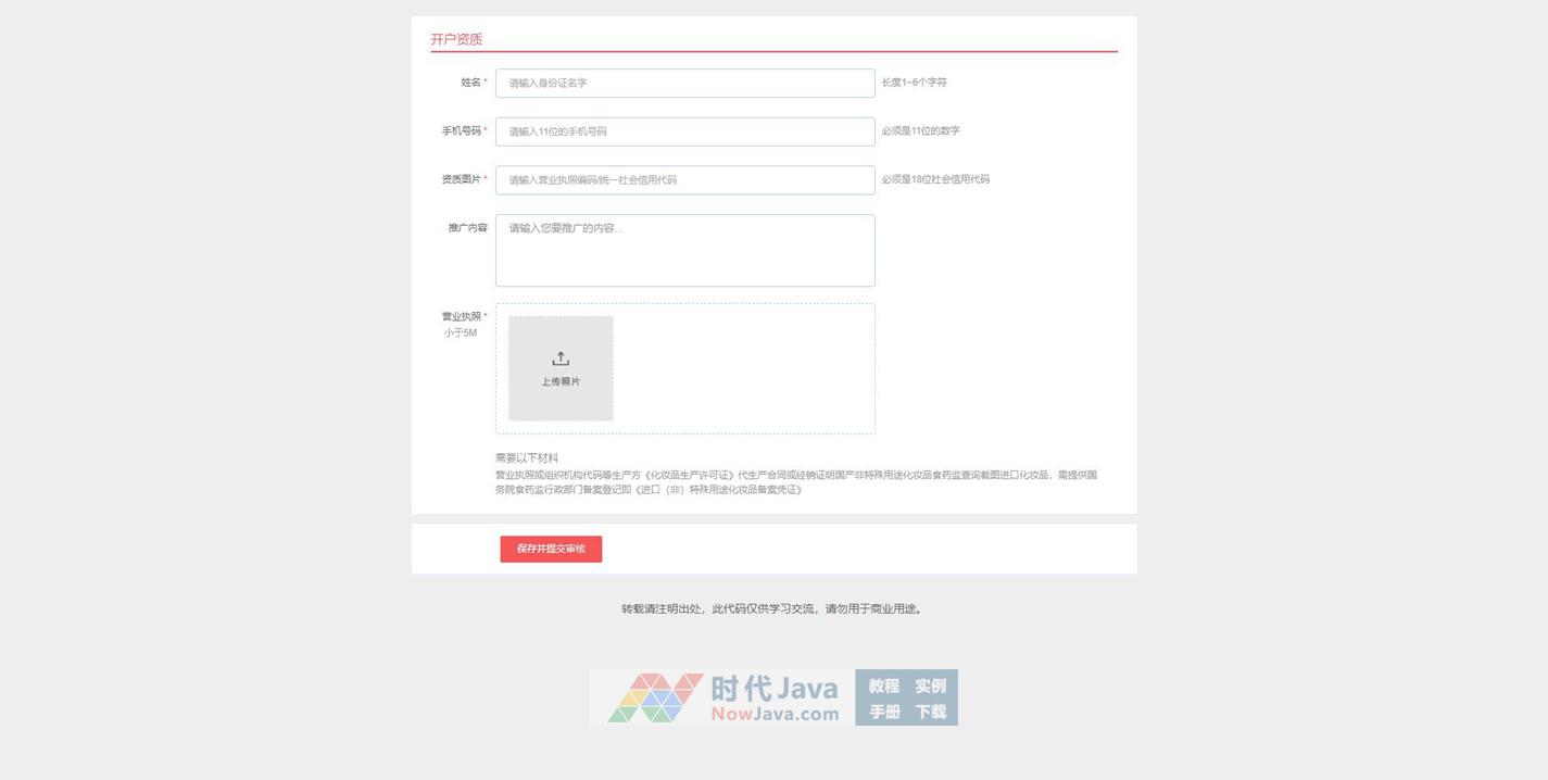 jquery表单验证提交图片上传代码是一款企业开户资质信息填写表单代码,支持表单验证, 图片上传支持在线预览以及在线删除保留等功能。