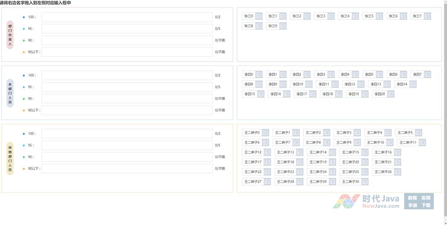 jquery鼠标拖拽元素内容到指定位置代码,可以将右边不同部门的人的名字拖入到左侧对应输入框中添加或删除功能代码。