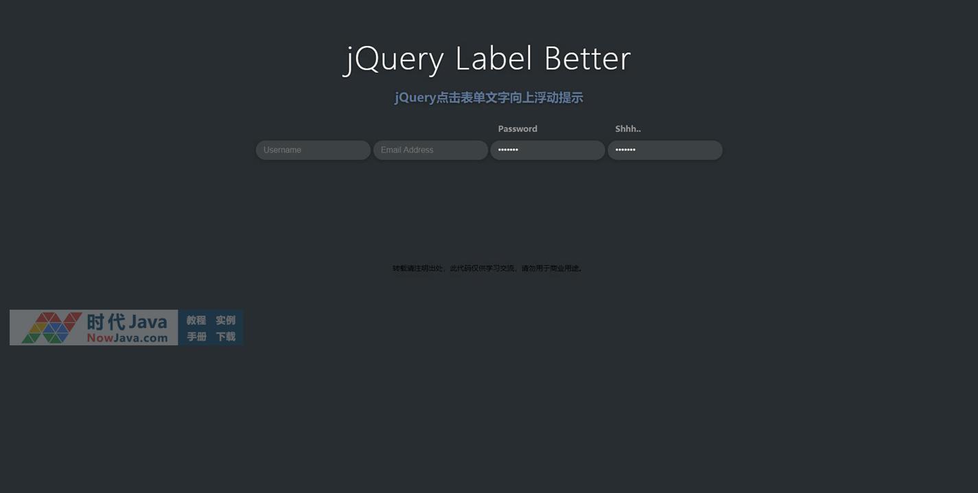 jQuery点击表单文字向上浮动提示是一款非常友好的标签提示插件jQuery Label Better,鼠标点击输入框,向上弹出文字提示信息,鼠标移走文字提示回到输入框,当文字输入表单时,文字在上方固定浮动。