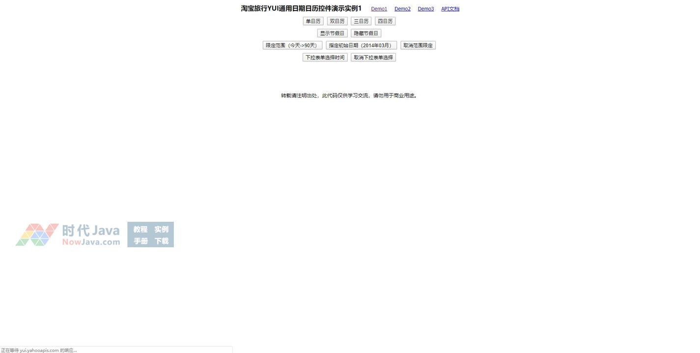 淘宝旅行YUI通用日期日历控件下载,由淘宝前端开发人员昂天开发,基于雅虎YUI3实现,界面简洁清晰,功能非常强大,不仅可以显示单日历,双日历,三日历,甚至四日历,还可以显示节日信息以及指定日期显示范围,非常值得学习和使用的,推荐下载。