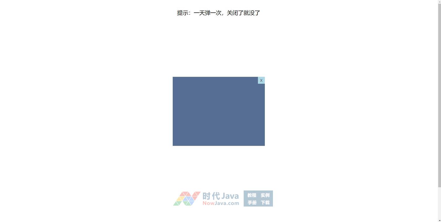 这是一款简单的jquery.cookie插件,可自定义设置多久弹一次,关闭了就不会再弹出来。