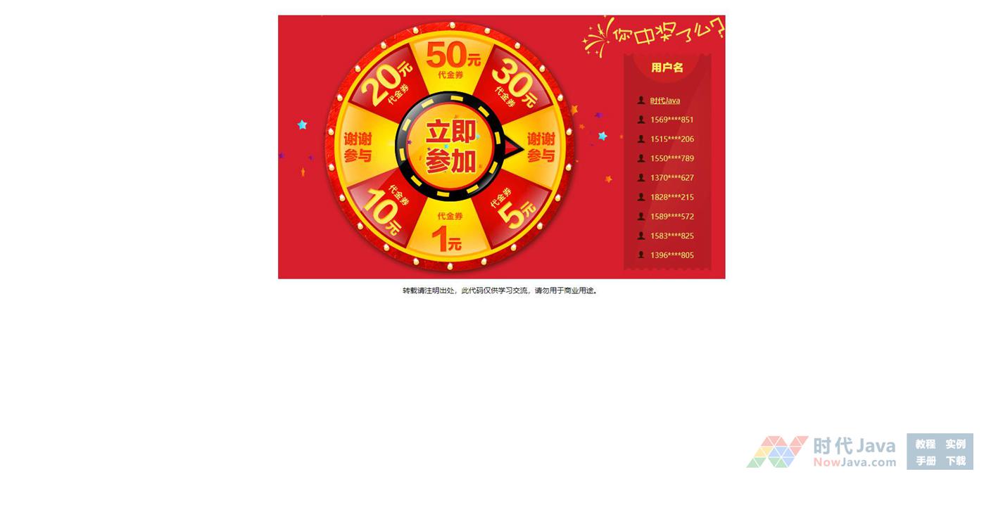jquery.rotate喜庆的转盘抽奖特效代码是一款基于jquery.rotate.min.js和jquery-1.8.3.min.js制作的抽奖活动网页代码,红色喜庆背景,有1元代金券,5元代金券,10元代金券,20元代金券,30元代金券,50元代金券,谢谢参与等奖项设置;抽奖活动页面右侧列出获奖人员名单。