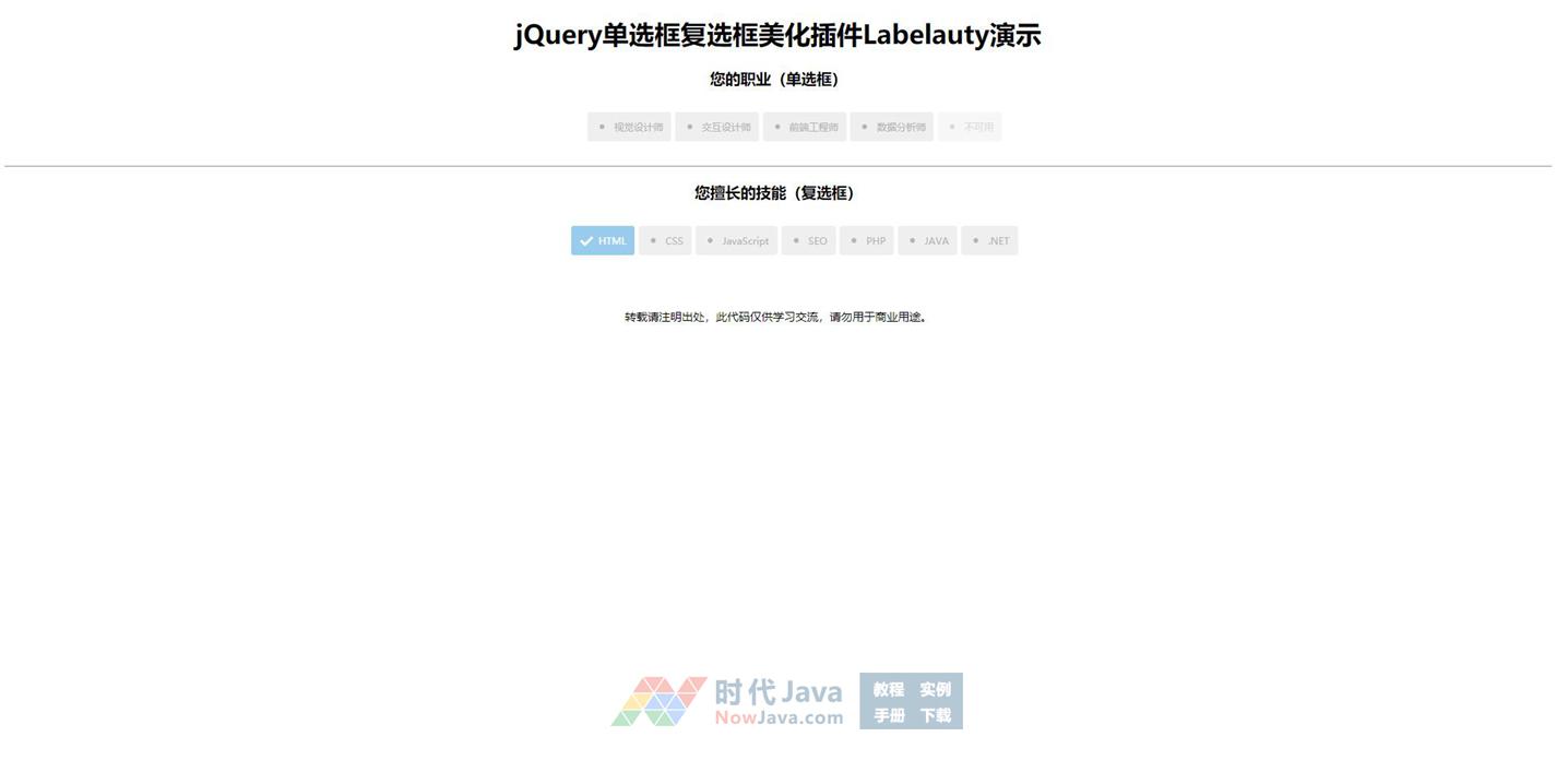 jquery单选框复选框美化插件Labelauty是一款非常小巧的jQuery插件。它除了能够实现单选框,复选框原本的选中,未选中,禁用等功能外,还能够设置选中和未选中的文本信息、标签的最小宽度等。
