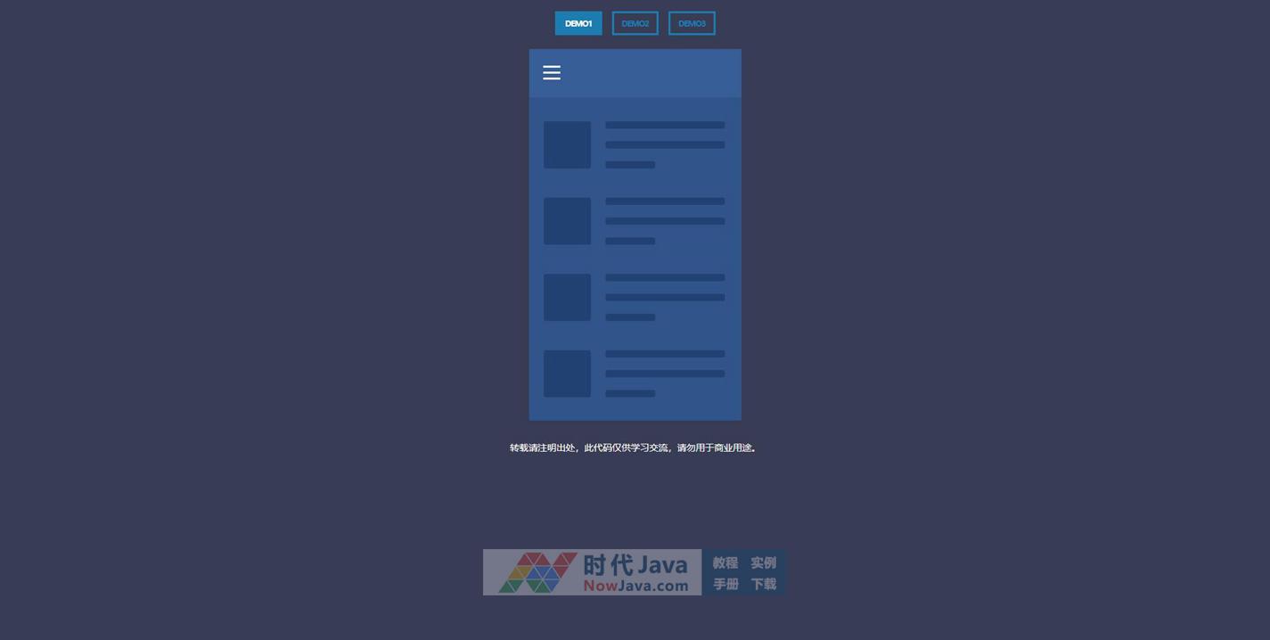 jquery css3移动端展开收缩手机菜单是一款带有三种不同的打开隐藏菜单效果,分别为滑动显示,Material Design风格效果和展开式效果。