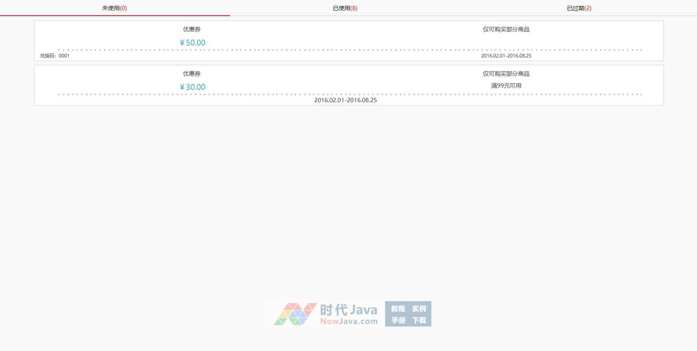 jquery手机端优惠券选项卡切换代码是一款手机团购APP常见的查看未使用已使用已过期等优惠券信息特效。