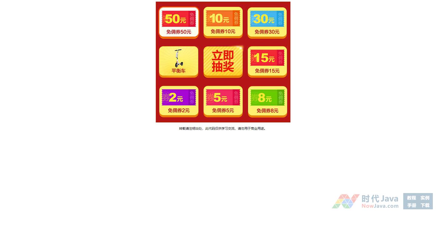 jquery九宫格布局抽奖转盘代码,模拟手机端应用app的抽奖天天送豪礼页面,用户可以点击抽奖按钮来随机获取奖品。