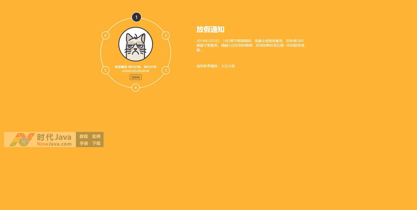 jquery圆形旋转文字说明案例展示代码,橙色创意风格的圆形转动切换公告及文章展示特效。