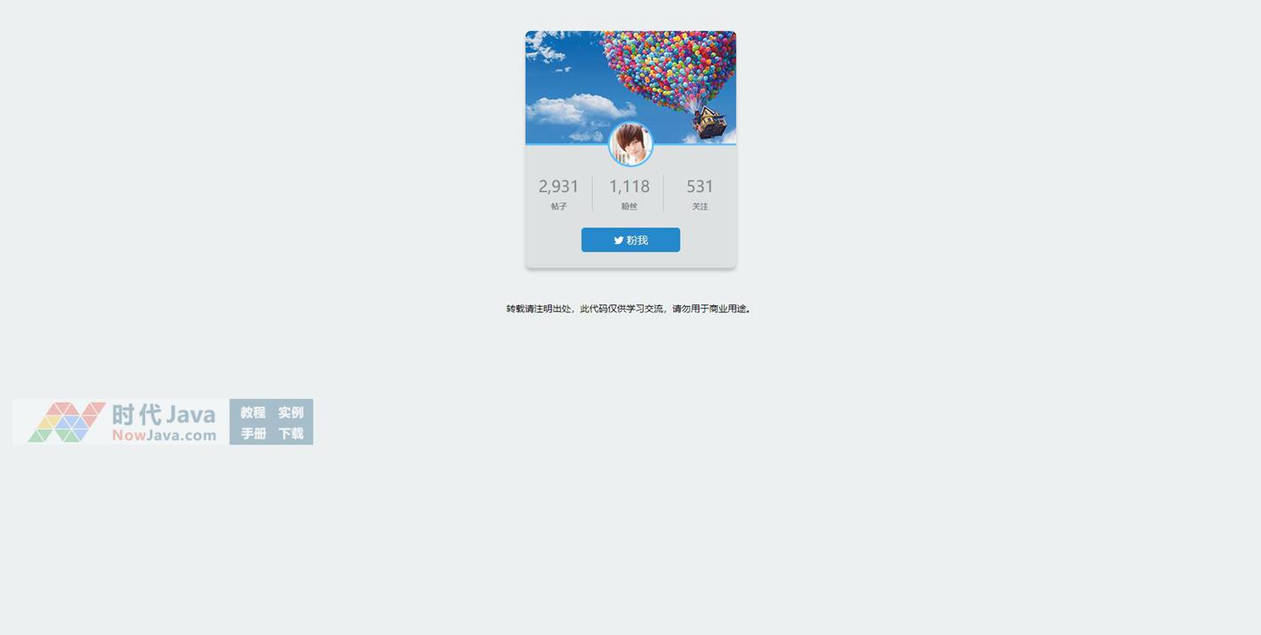 jquery css3关注加粉个人卡片代码,鼠标悬停在图片上面的时候显示用户的个性签名,下面显示帖子数跟粉丝数以及关注数,点击下面的粉我按钮可以关注加粉。