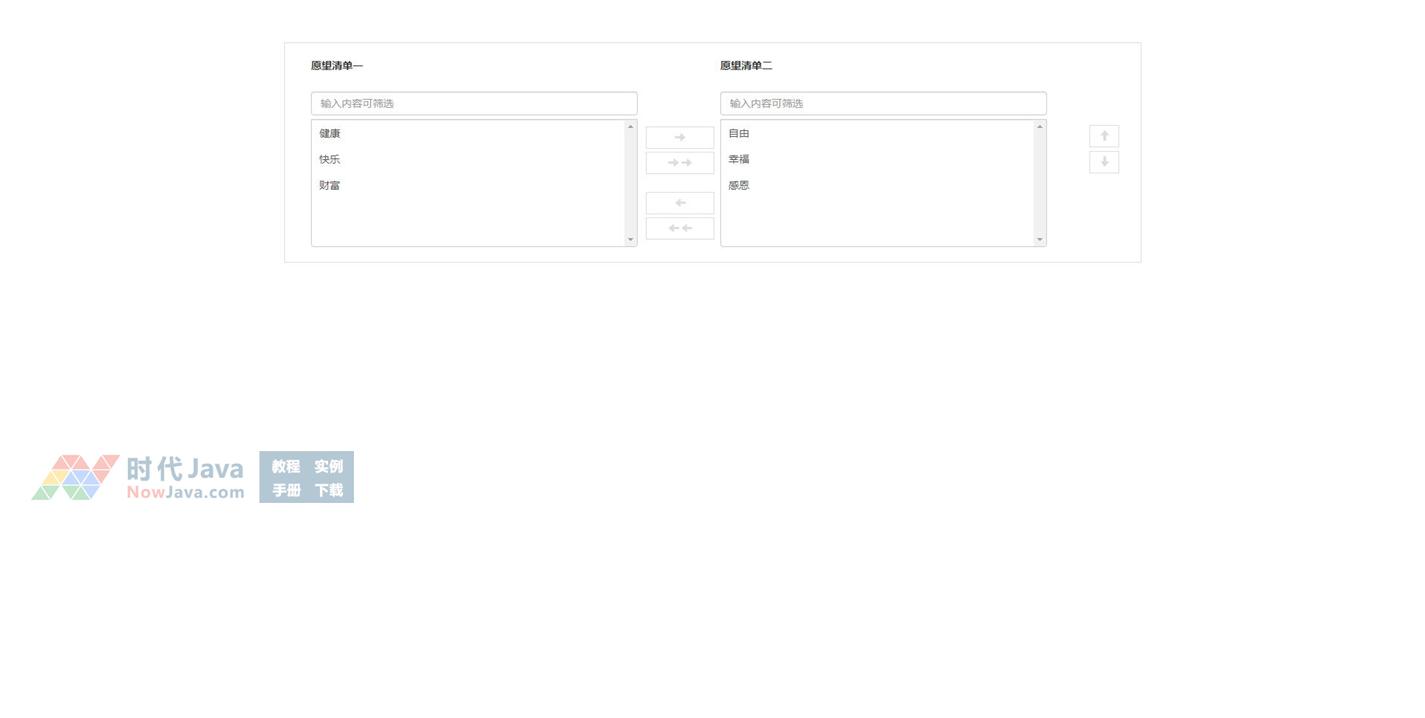 jquery左右清单双向列表切换插件,可以点选左右任意内容移动到相反列表里面,也可以在输入框内容输入自己想要的内容来筛选过滤,也可左右全部互换移动。