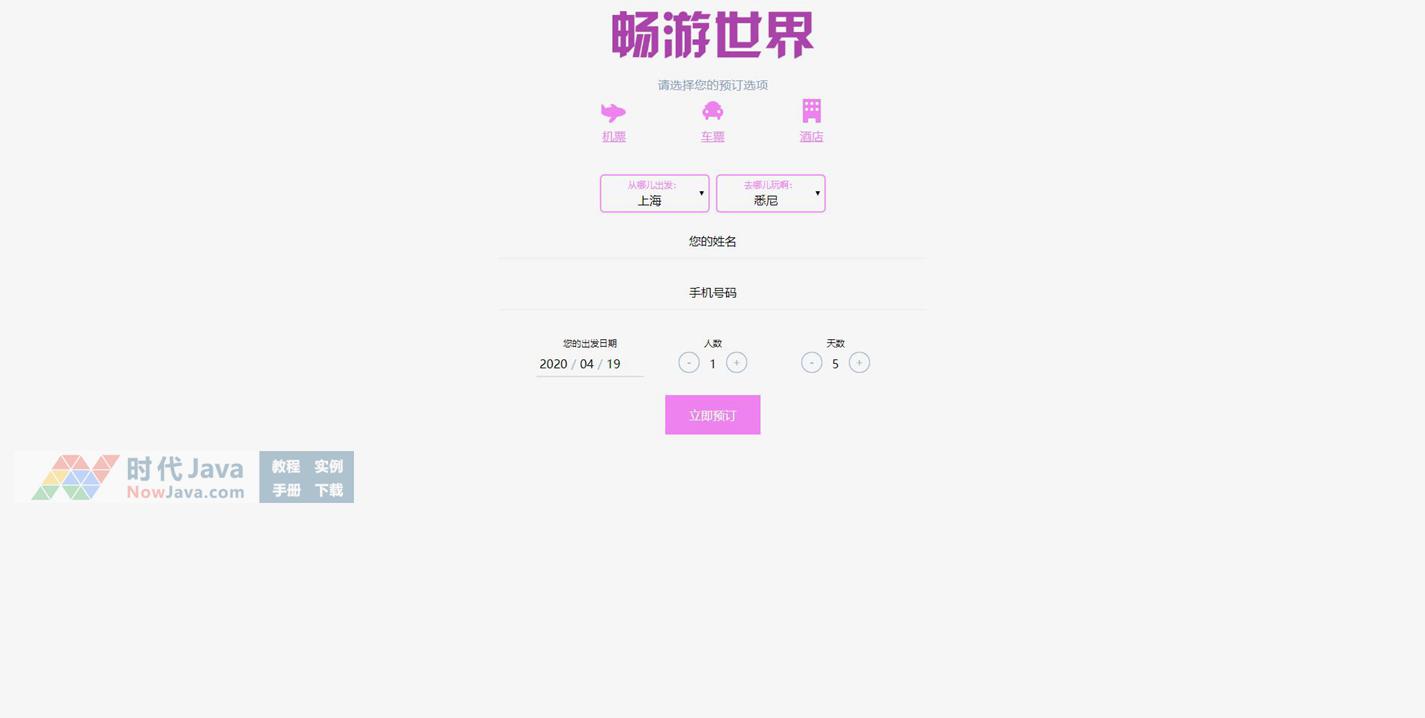 机票车票酒店预订表单网页特效,可以选择不同的预订类型,选择不同的城市,输入姓名和手机号,打开日历点选出发日期,设置人数和天数后提交表单。