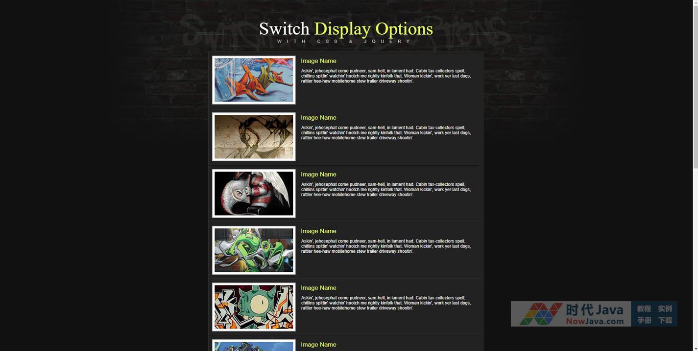 Switch Display Options是一个很有意思的jQuery特效,它可以把当前页面图片+标题+简要的详细模式无刷新地切换为三列图片+标题简洁模式,适合用户在网站上自由选择喜欢的图片显示方式,很有人性化的一个功能。