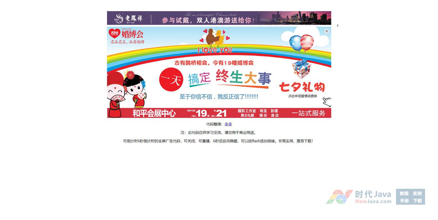 可倒计时6秒倒计时的全屏广告代码,可关闭,可重播,6秒后自动隐藏,可以给flash添加链接。非常实用,推荐下载!