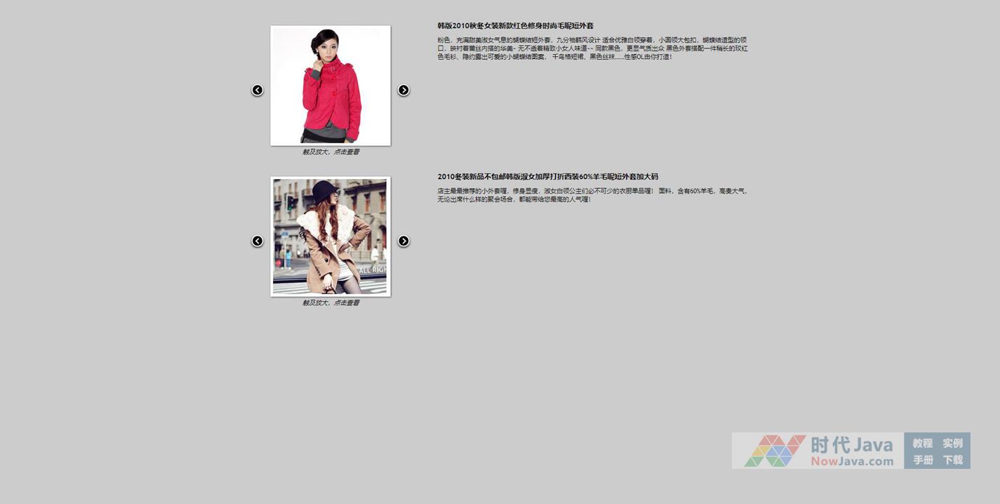 基于jQuery的图片特效,具有图片滑动和放大镜效果的功能,用来展示平时网页制作中常用的产品列表,每个产品有多张图片,且图片鼠标触及的时候,拥有放大镜效果。这个jquery多图片一组滑动并放大镜效果绝对是相对于商城、博客、B2C/C2C之类的列表利器。
