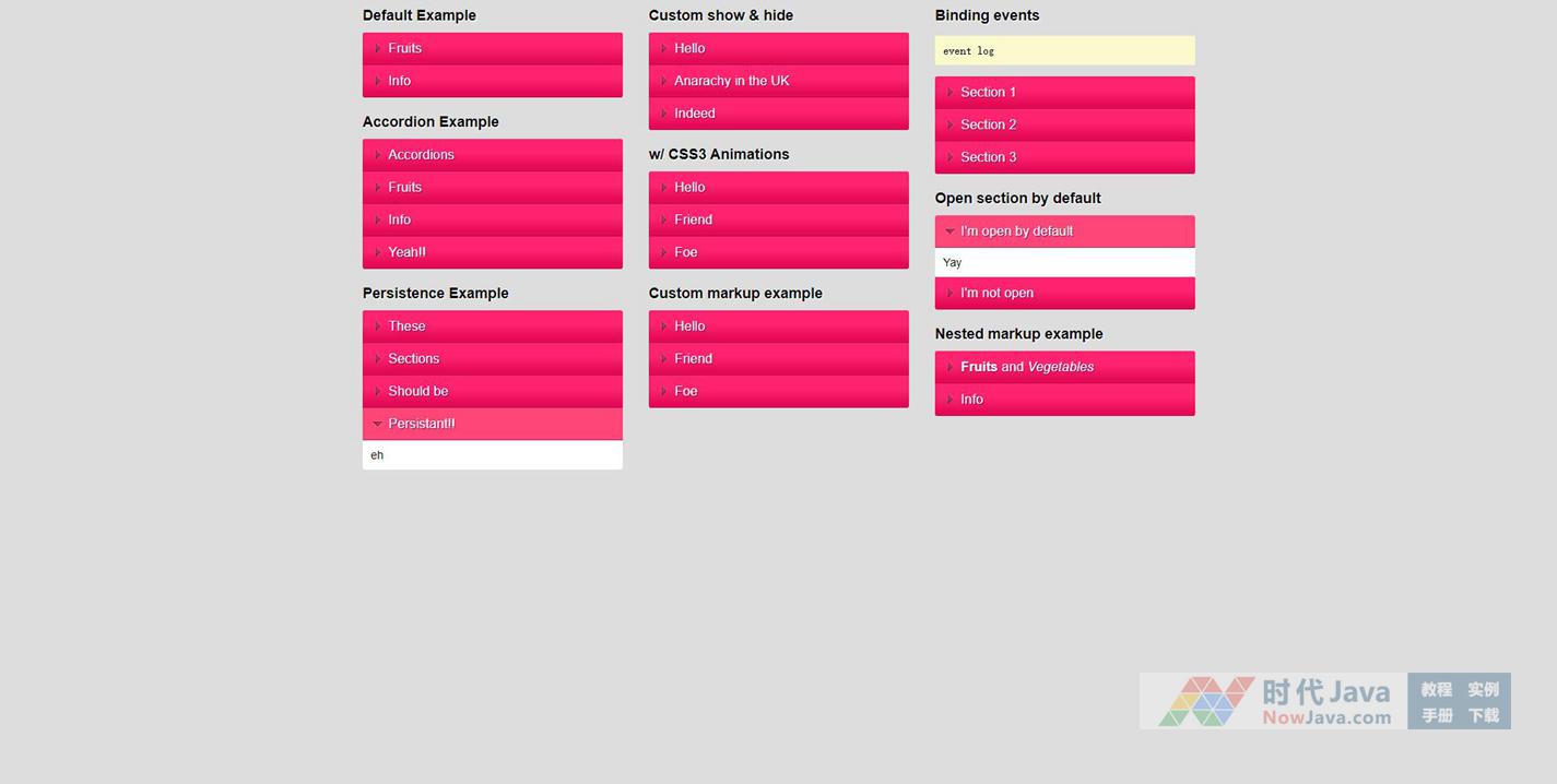今天给大家推荐的这款手风琴特效,当然也可以叫做侧栏菜单导航,集中了当今比较流行的竖向菜单导航,既可以控制只展开一个,亦可以点击展开或者折叠,你所能想到的展现方式里面几乎度集中了,也不缺乏CSS3风格的导航