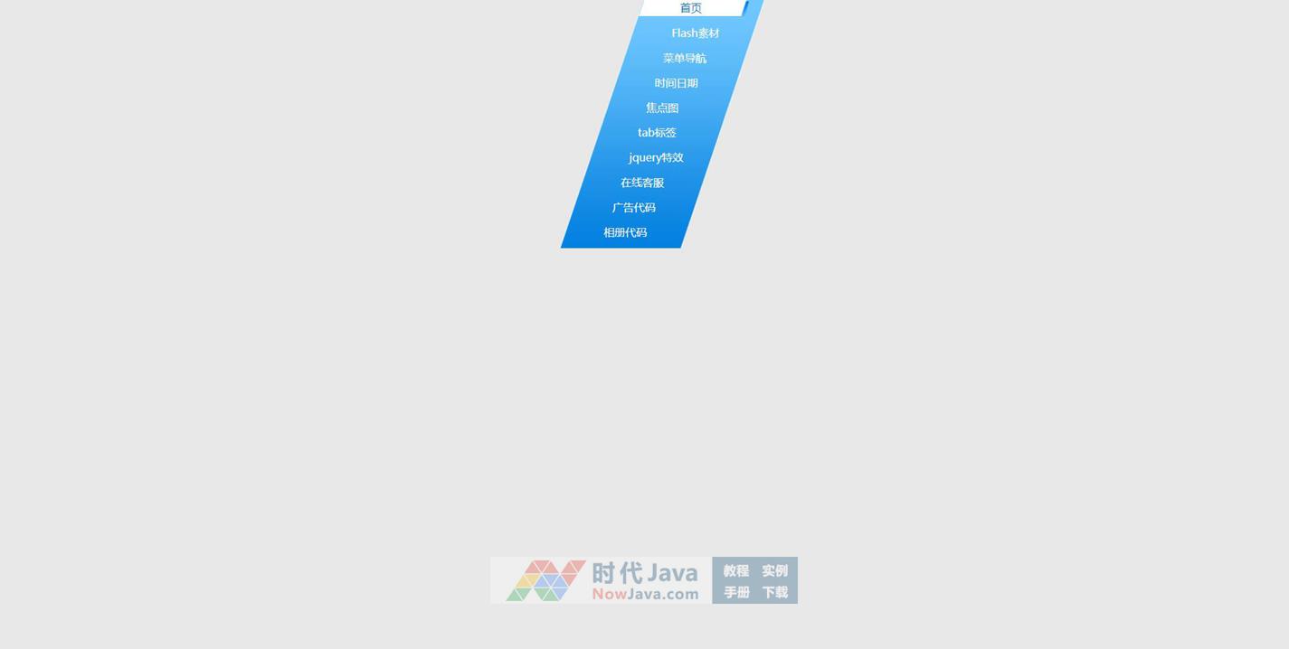实现原理:其实是先做一个倾斜的背景图片,用background将图片定位,每行li标签默认是左对齐的,用JS依次控制li标签距离左侧DIV的距离,即可实现错开排列,用倾斜的png小图片作为背景后即可实现看起来倾斜的导航效果