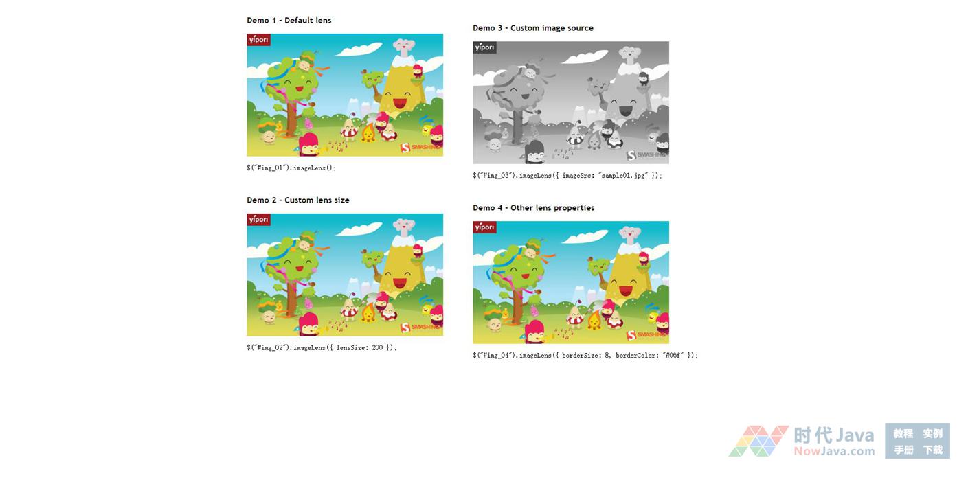 国外某网站复制过来的一款jquery放大镜效果,分四种不同效果,放大镜镜头可大可小。