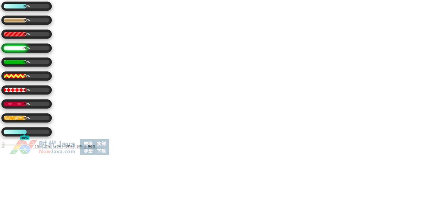 10款时尚漂亮的jQuery css3百分比进度条动画特效,10种样式各有特色,有动感效果、发光效果等。非常不错的网页进度条插件。