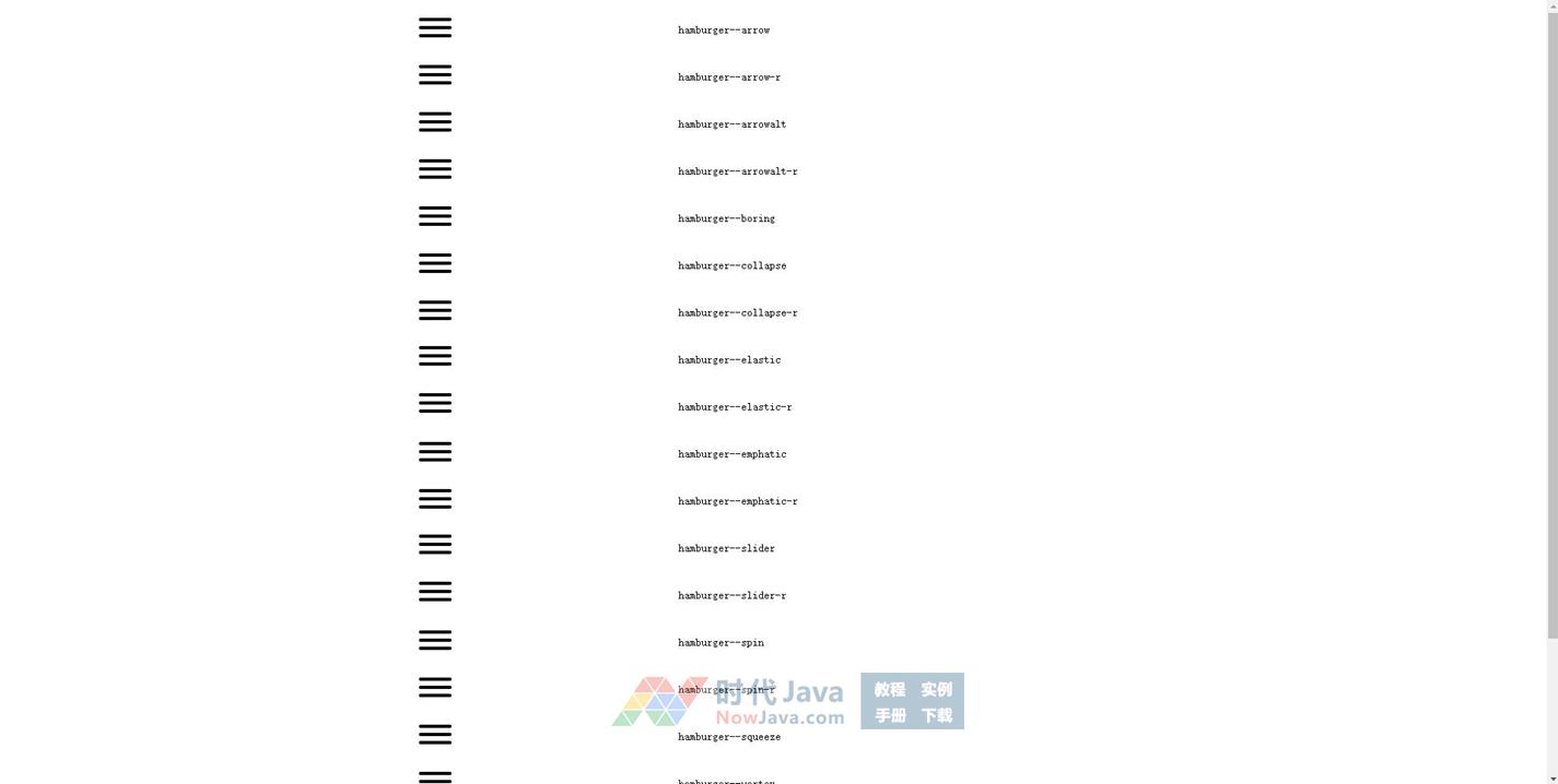 本素材里面包含18种不同的汉堡图标变形动画效果,分别是汉堡图标与前进后退关闭图标之间的动画切换,你可以通过Sass文件来自定义你自己的汉堡包图标变形动画、颜色、大小之类。