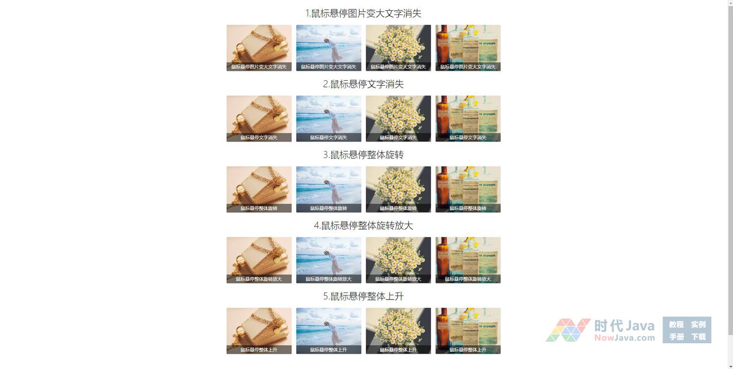 5种常用的css3实现的鼠标滑过图片动画效果,分别是鼠标悬停图片变大文字消失、鼠标悬停文字消失、鼠标悬停整体旋转、鼠标悬停整体旋转放大、鼠标悬停整体上升图片文字css3动画特效代码。